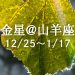 そして、太陽が山羊座に移動する同じ日、日が最も短くなり、夜が最も長くなる冬至を迎えます。東洋思想でいうと、「陰極まりて陽に転ず」であり、「一陽来復」の瞬間です。世界も、個人も、塞がっていたものが次第に開かれていくはず。新しい年、新しい世界がゆっくりとその姿を表していく──それが太陽が山羊座に滞在する「山羊座の季節」です。