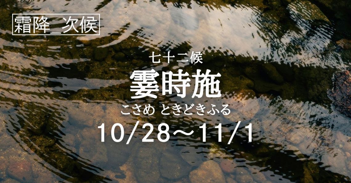二十四節気「霜降」の次候は七十二候「霎時施(こさめ ときどきふる)」の5日間となります。 七十二候で「霎時施(こさめ ときどきふる)」という時季に入ります。 「霎」という漢字は「こさめ」と読みます。この「こさめ」は秋雨の…