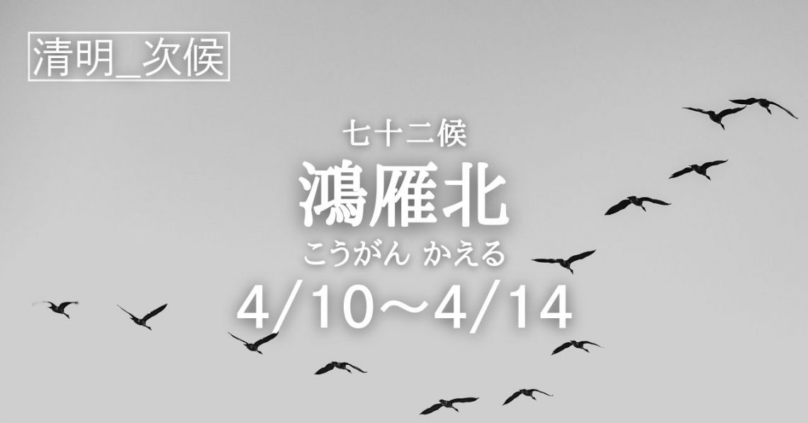 二十四節気「清明」の次候が、七十二候の「鴻雁北(こうがん かえる)」です。 清明節の次候は「鴻雁北(こうがん かえる)」です。10月の寒露節にある「鴻雁来(こうがん きたる)」と対をなします。清明節の初候が「玄鳥至(つば…